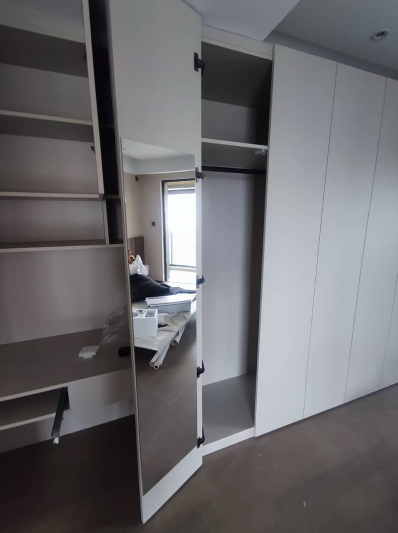 如果采用软镜方案,最好预先跟你的设计师说好,安装到衣柜最边缘的门上,并使用大角度铰链,这样柜门可以几乎完全打开,照镜子不用侧着照。 另外,需要注意柜门背后的拉直器是否凸起,可能会影响安装。像爱格这种一门到顶无拉直器的就不需要担心这种问题了。