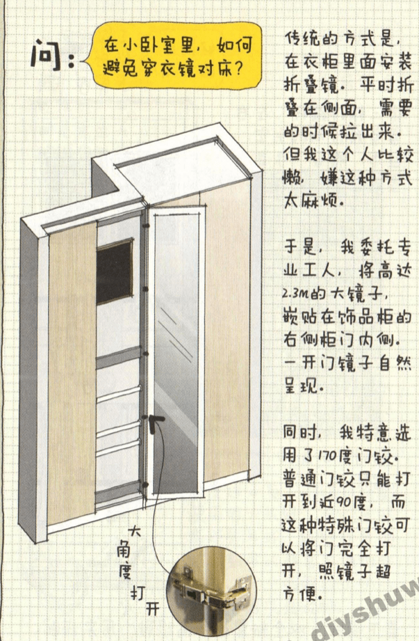而卧室装镜子,很多人的第一反应就是风水。我虽然坚决将风水斥之迷信,但终归要解决心理需求,不想在不需要的时候看见镜子就是一种需要解决的诉求。