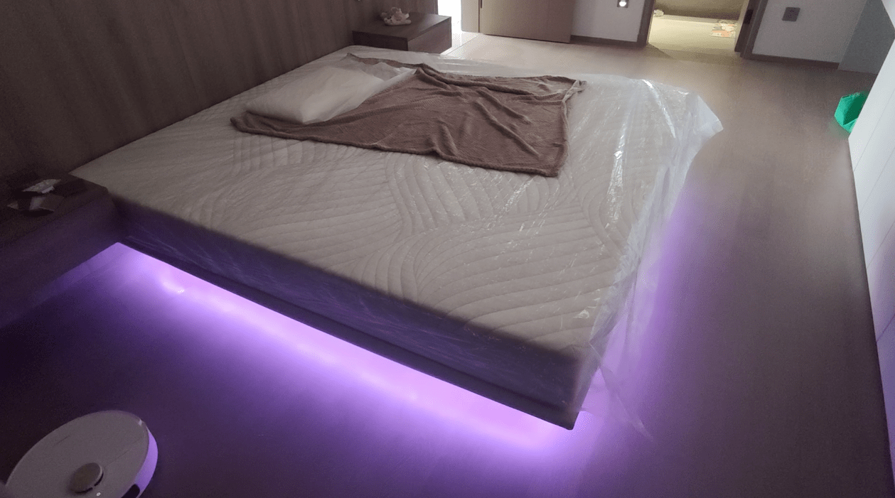 再加一圈灯带更能强化感受,但是成品床加个灯带往往要六七百,价格太黑。最后我自己买了易来的RGB灯带,不到400元,还能接入米家。