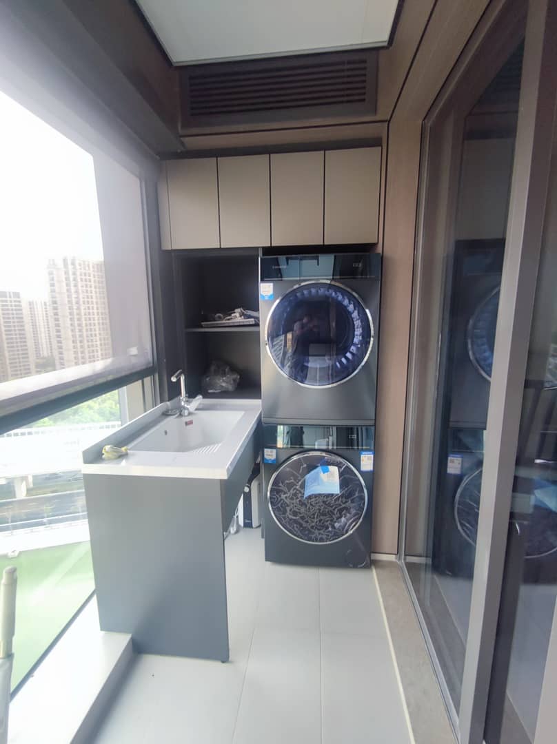 好处一是洗衣服时可以鸟瞰风景,二是有充足的空间摆放小厨宝与带上下水的扫拖机。