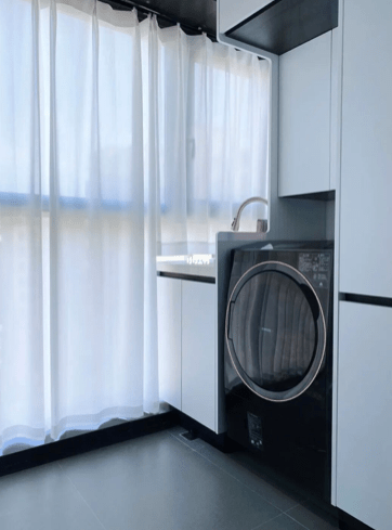 因为家人坚持要求水槽带搓衣板,而1.2米的阳台宽度不足以在洗烘一侧仅剩的空间里做一个带搓衣板的水槽,最后只能做成了这样。