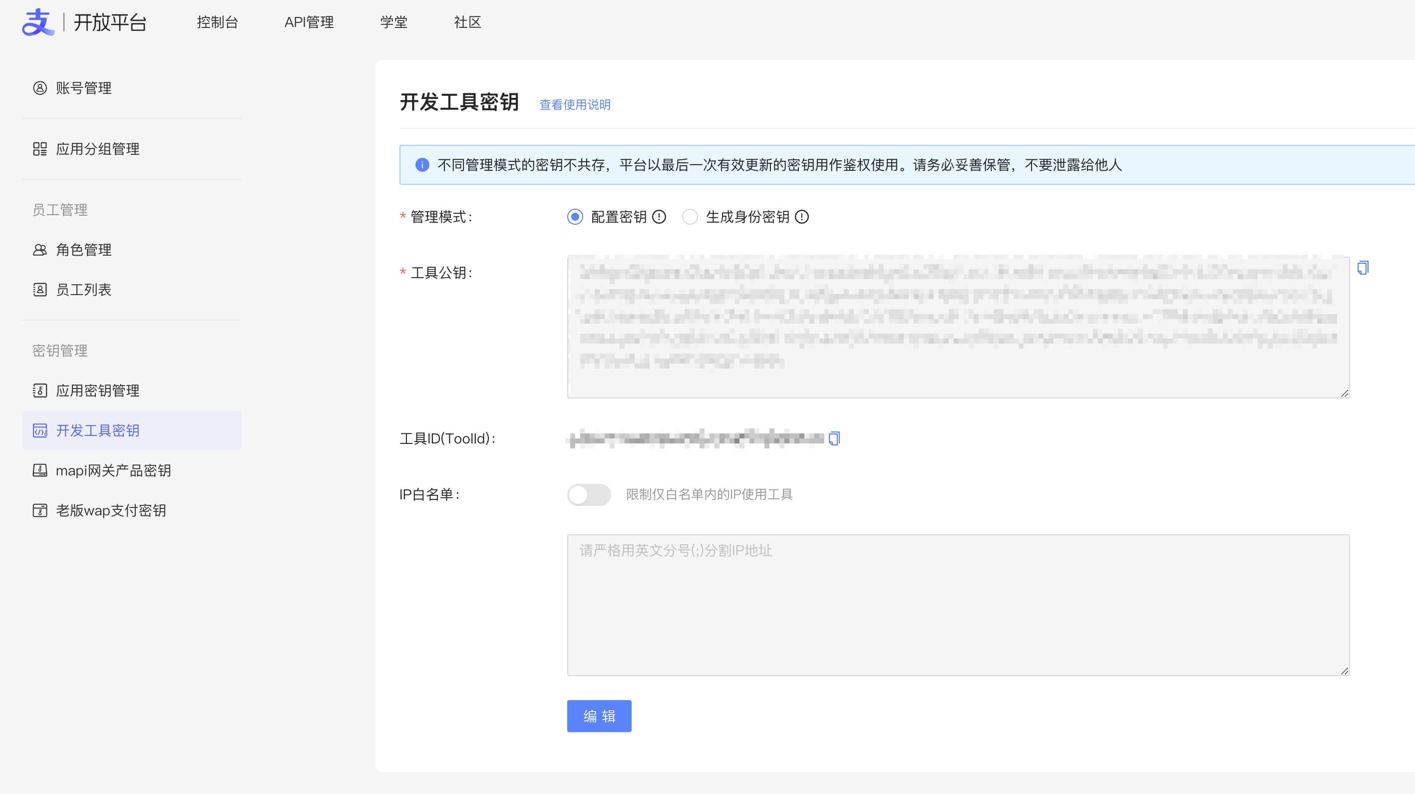 将密钥文件下载到安全的位置。由于我们的项目是私有库,这里就直接放到了项目deploy/alipay目录下。多个小程序的密钥可以放在一起,这里我将密钥起名为${appid}.json。